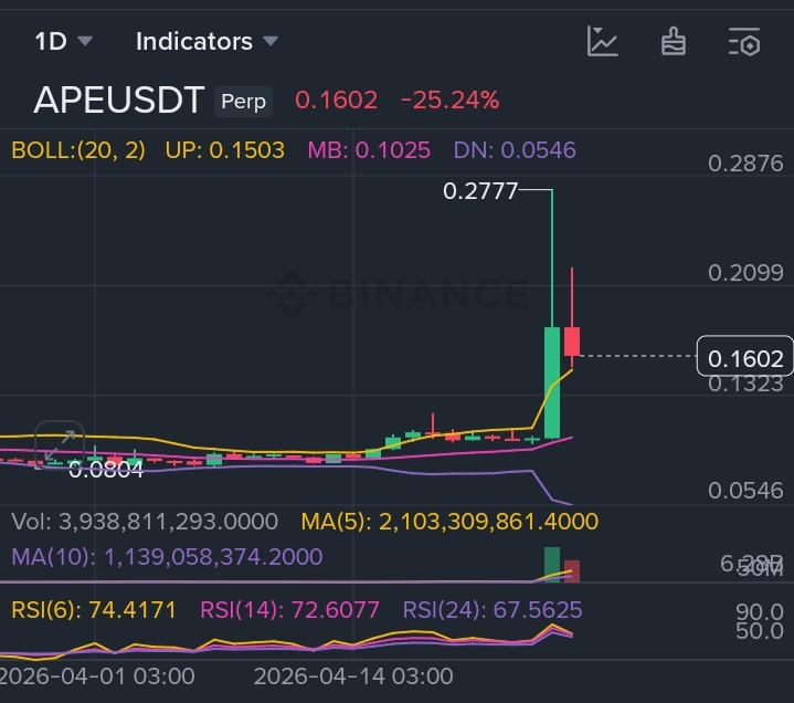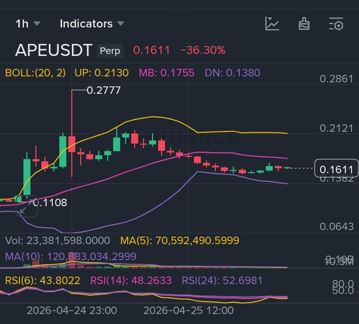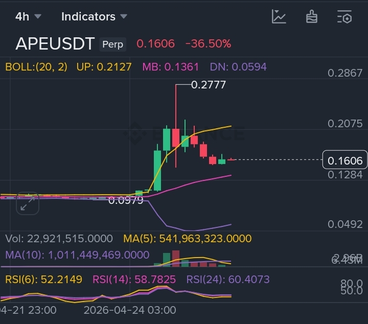 🚀 From April 21-24, APE skyrocketed from 0.0804 directly to 0.2777 — a pump of over 245% in just a few days.