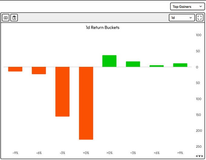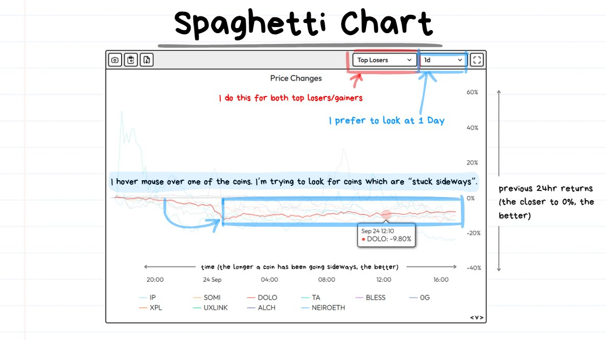 Đầu tiên, tôi sẽ bắt đầu với Biểu đồ Spaghetti trên Velo với các đồng tiền tăng/giảm mạnh nhất trong ngày để giúp tôi tìm ra bất kỳ phạm vi biến động tiềm năng nào.