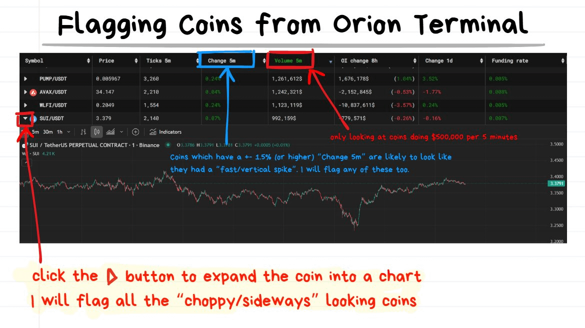 1) Tôi sẽ nhanh chóng lướt qua tất cả các biểu đồ của các đồng tiền đang có khối lượng giao dịch ít nhất 500.000 đô la trong 5 phút trước đó và đánh dấu bất kỳ đồng tiền nào trông giống như "Biến động/Đi ngang".