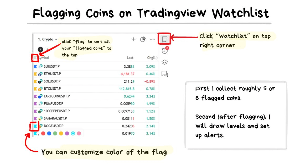 ⚠️Lưu ý: khi đánh dấu, tôi đang chuẩn bị một danh sách các đồng tiền để thực hiện phân tích kỹ thuật cho bước tiếp theo.