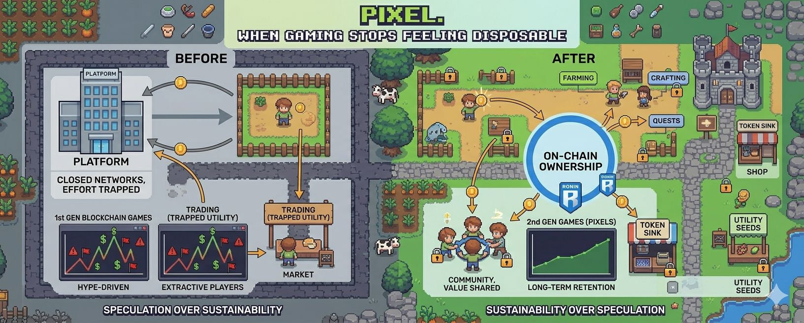 This is where Pixels is different from early blockchain games. Earlier projects showed that NFTs, tokens and player-owned assets were possible. Many of them failed to create worlds that people wanted to stay in. The rewards were often too generous. Caused inflation the gameplay was shallow and players were mostly there for the profit. When the incentives went away people lost interest. Pixels is a second-generation game: ownership without people sticking around is fragile and demand for tokens without a community is temporary.