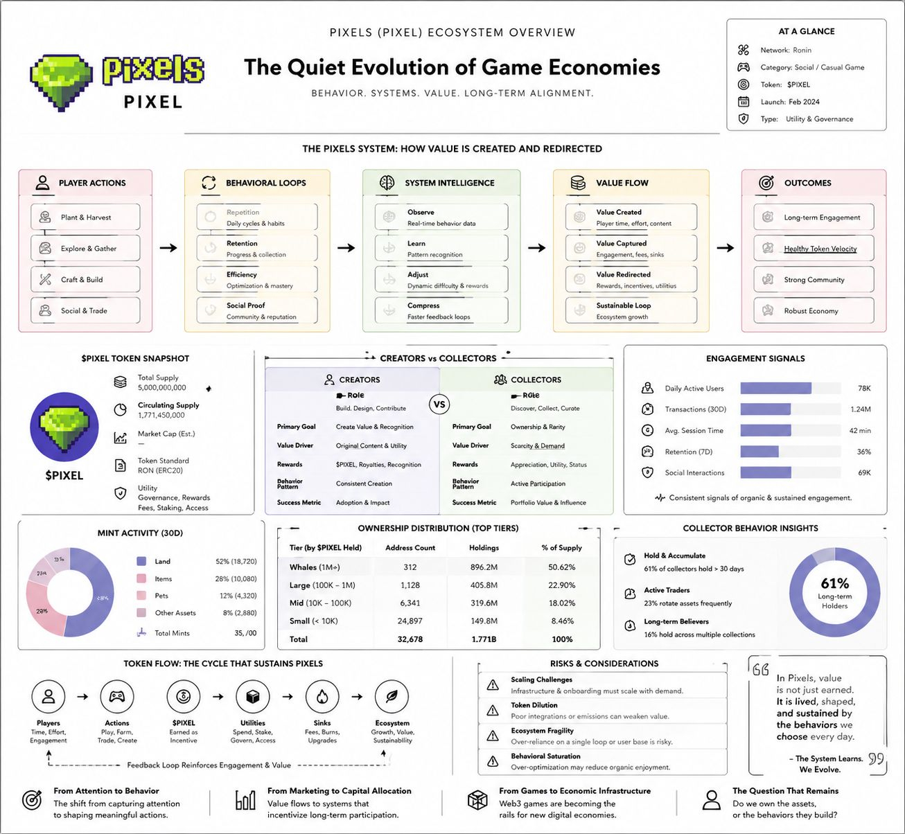 However, like any system, Pixels isn’t without its risks. As the game grows, it faces challenges typical of Web3 economies—scaling issues, dilution from weak integrations, and fragility across different player bases. There’s a fine balance to strike between creating a system that’s engaging and one that remains resilient across a broad spectrum of users. If the system fails to scale properly or if integrations weaken over time, the value created by the game could erode, leaving the system vulnerable to collapse.