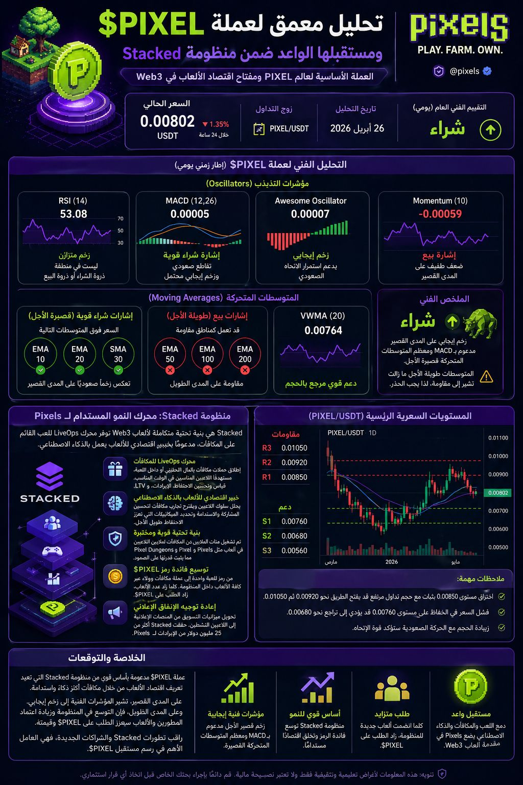 Based on the latest technical analysis as of April 26, 2026, the $PIXEL (PIXEL/USDT) currency shows mixed signals with a short-term positive bias. The current price of the currency is 0.00802 USDT, with a slight decrease of 1.35% over the past 24 hours.