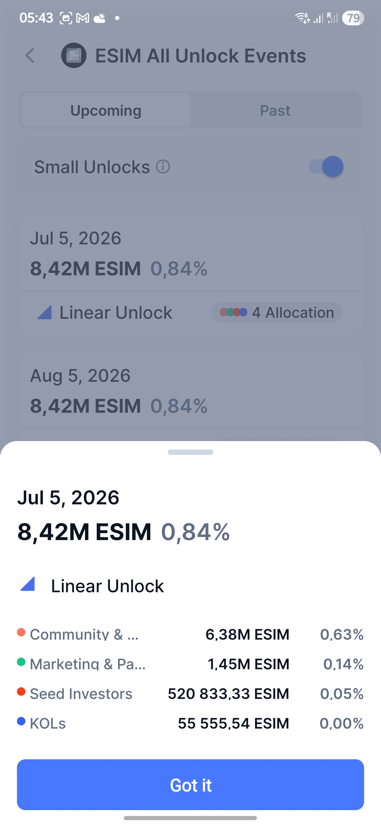 Let’s look at the upcoming dates (e.g., July 5, 2026). Only 8.42M ESIM(0.84% of the total supply) will be released into the market. This is a microscopic volume compared to current liquidity. But more importantly—who is receiving these tokens?