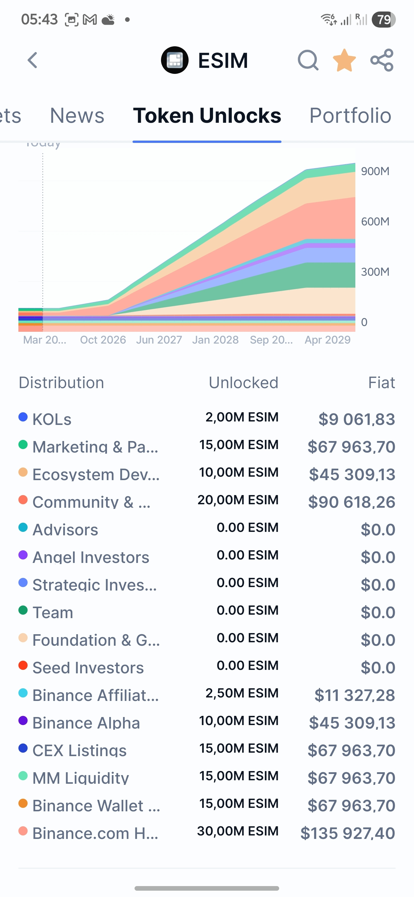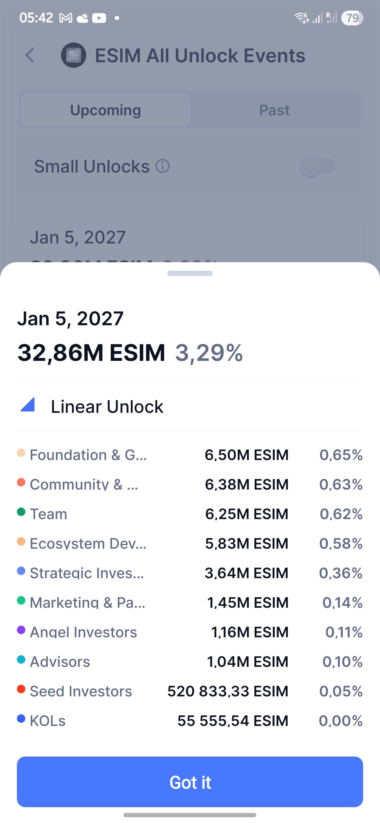 Now, let’s examine the major unlock schedule. The actual mass of tokens will hit the market only on January 5, 2027 — 32.86M $ESIM (3.29%).