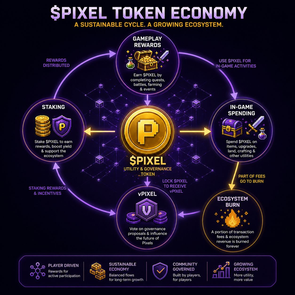 Most play-to-earn games die because they print tokens faster than players can spend them. Pixels ran into this problem early and — importantly — actually addressed it. The Chapter 2.5 update cut daily token inflation by nearly 84%. That's an aggressive move, and it shows the team is serious about sustainability over short-term hype.