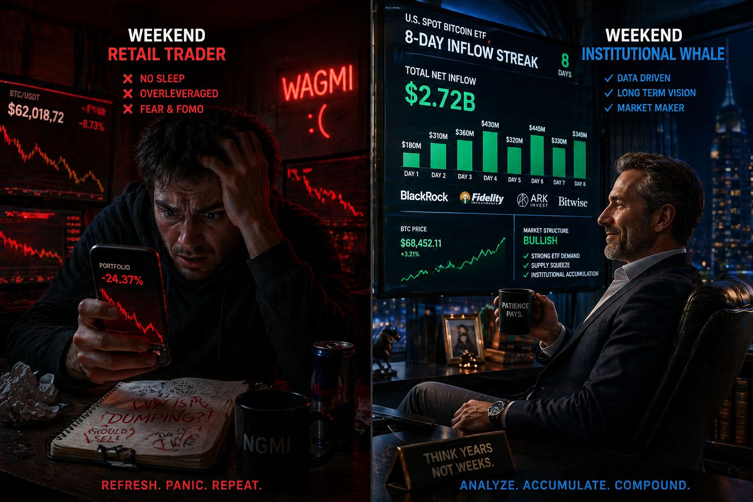 But most importantly — zoom out. Look at the 8-day ETF streak. Look at Morgan Stanley. Look at the whale data.
