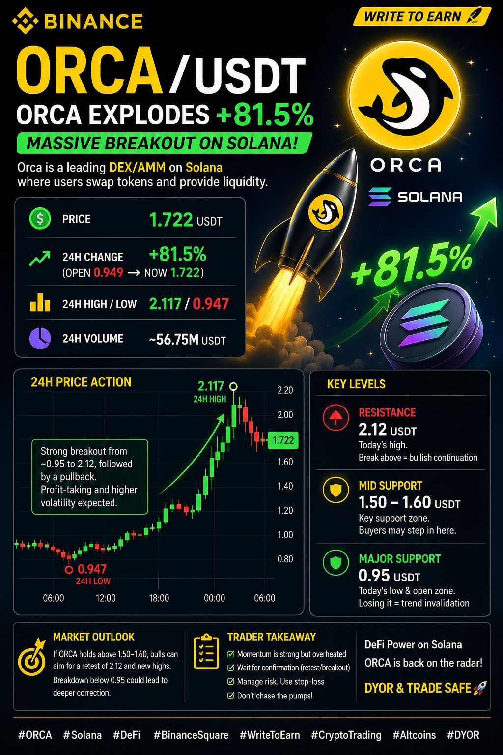 The DeFi space on Solana is heating up again, and Orca ($ORCA ) is leading the charge with an explosive +81.5% move in just 24 hours. This sharp rally has pushed ORCA from 0.95 USDT to a high of 2.12 USDT, before settling near 1.72 USDT at the time of writing.