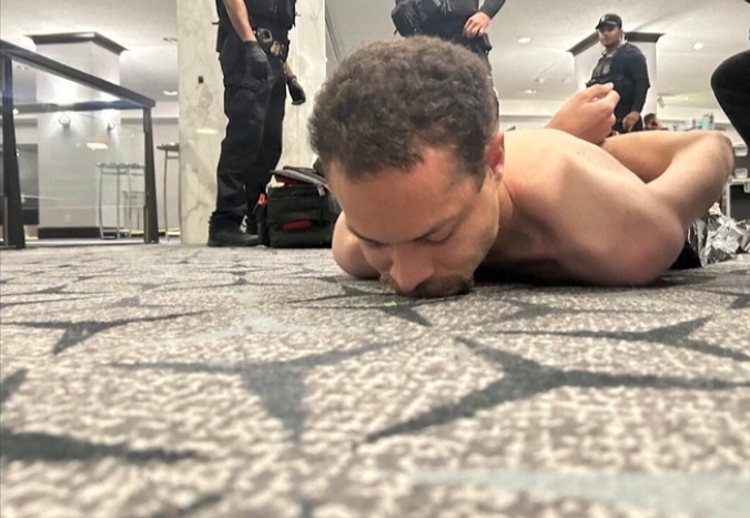 The close-up photo shows a shirtless man on the floor with his hands cuffed behind his back with Secret Service standing around him.