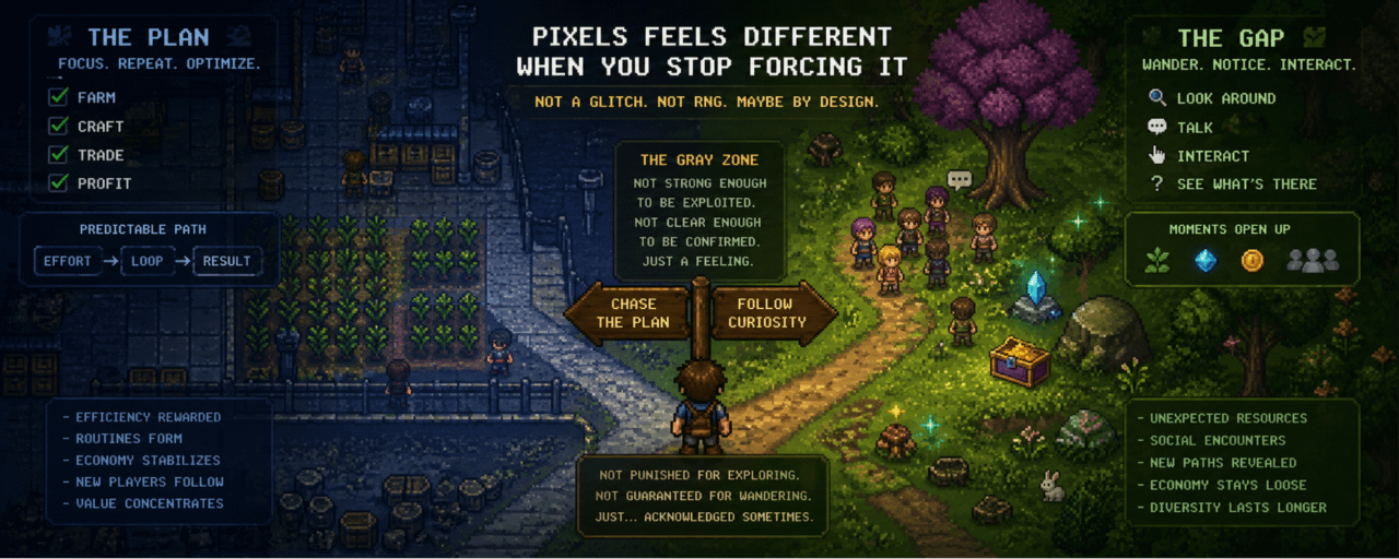 I keep running into this way of playing in Pixels. It does not show up all the time. It shows up in gaps. Moments where I am not chasing anything