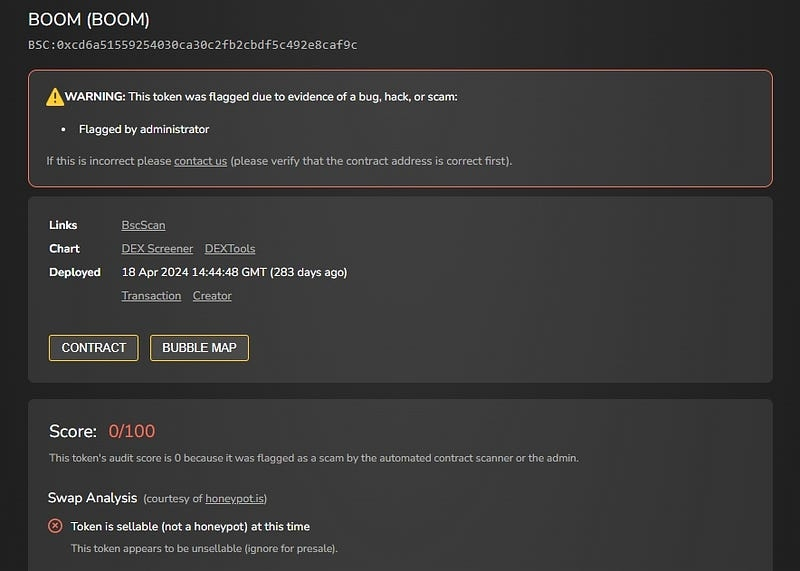 In addition, some scam tokens don’t offer locked liquidity at their release, implying that creators can withdraw the entire liquidity pool at any time. Another deceptive tactic includes imposing a 100% sell tax, which means that any attempt to sell results in the entire amount being deducted as a fee, effectively making the token impossible to cash out.