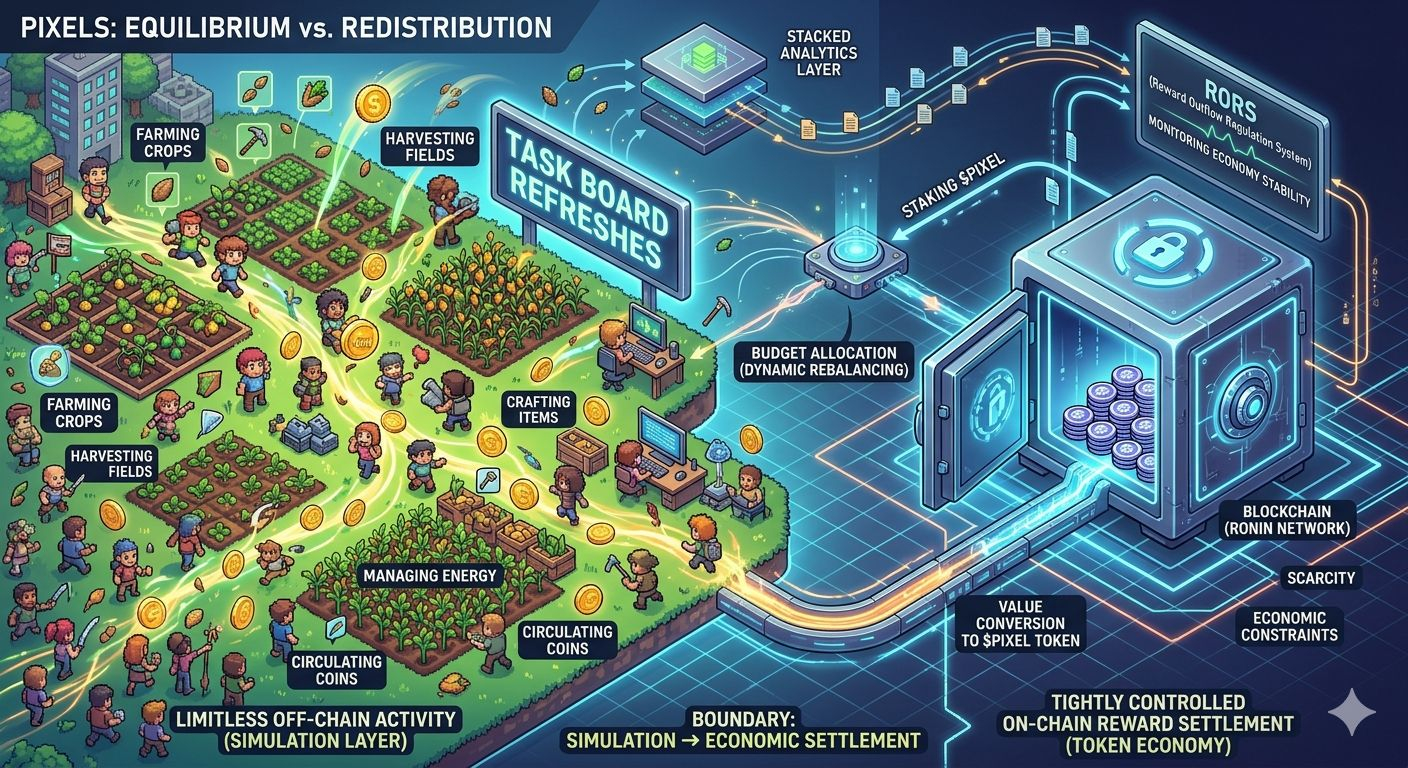 Pixels appears to manage this pressure through internal control mechanisms designed to regulate reward outflows. Systems such as RORS the Reward Outflow Regulation System likely monitor how quickly tokens are leaving the ecosystem. If reward extraction becomes too aggressive, the system can rebalance tasks, adjust reward structures, or redistribute incentives to maintain economic stability.