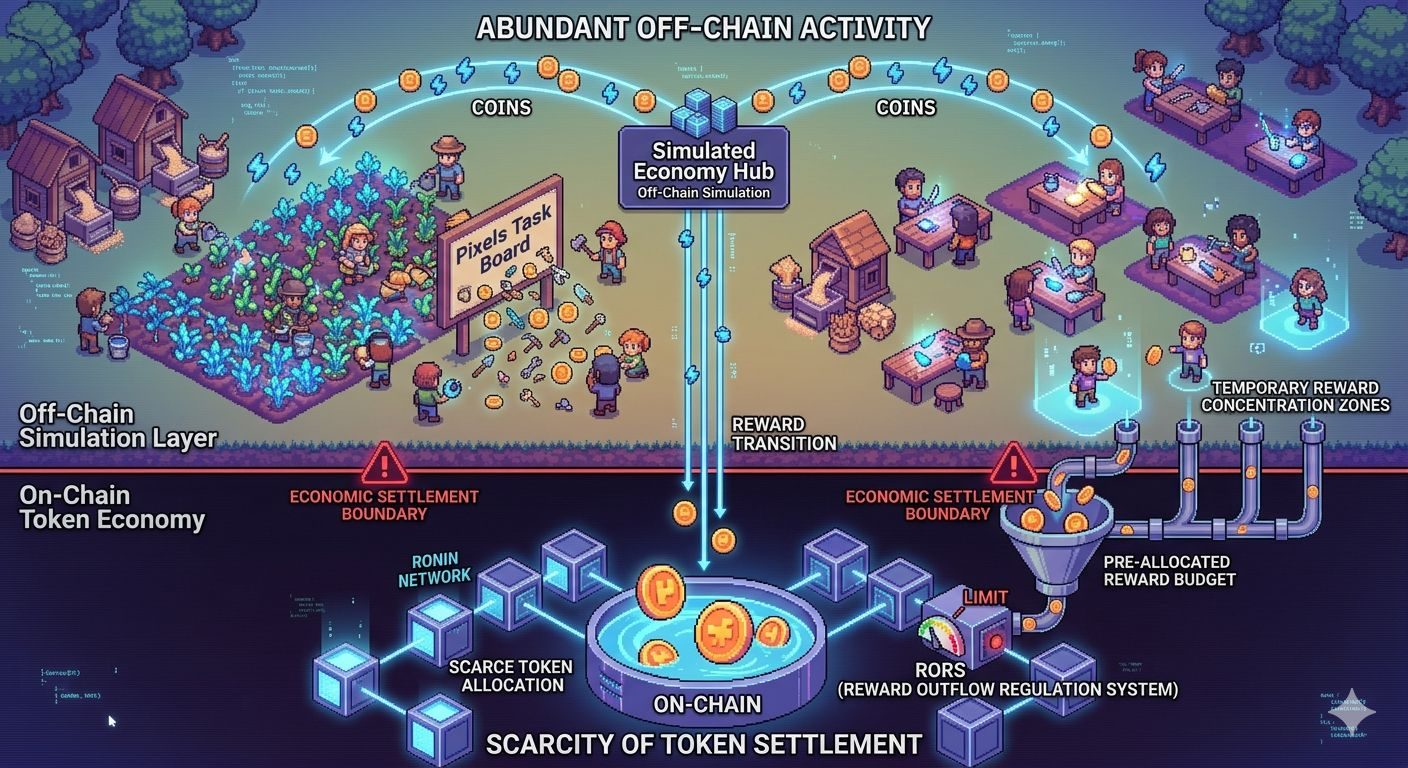 The blockchain only becomes relevant when rewards transition from that simulated environment into the token economy specifically when value converts into the PIXEL token. At that moment, the system crosses a boundary from simulation into economic settlement.