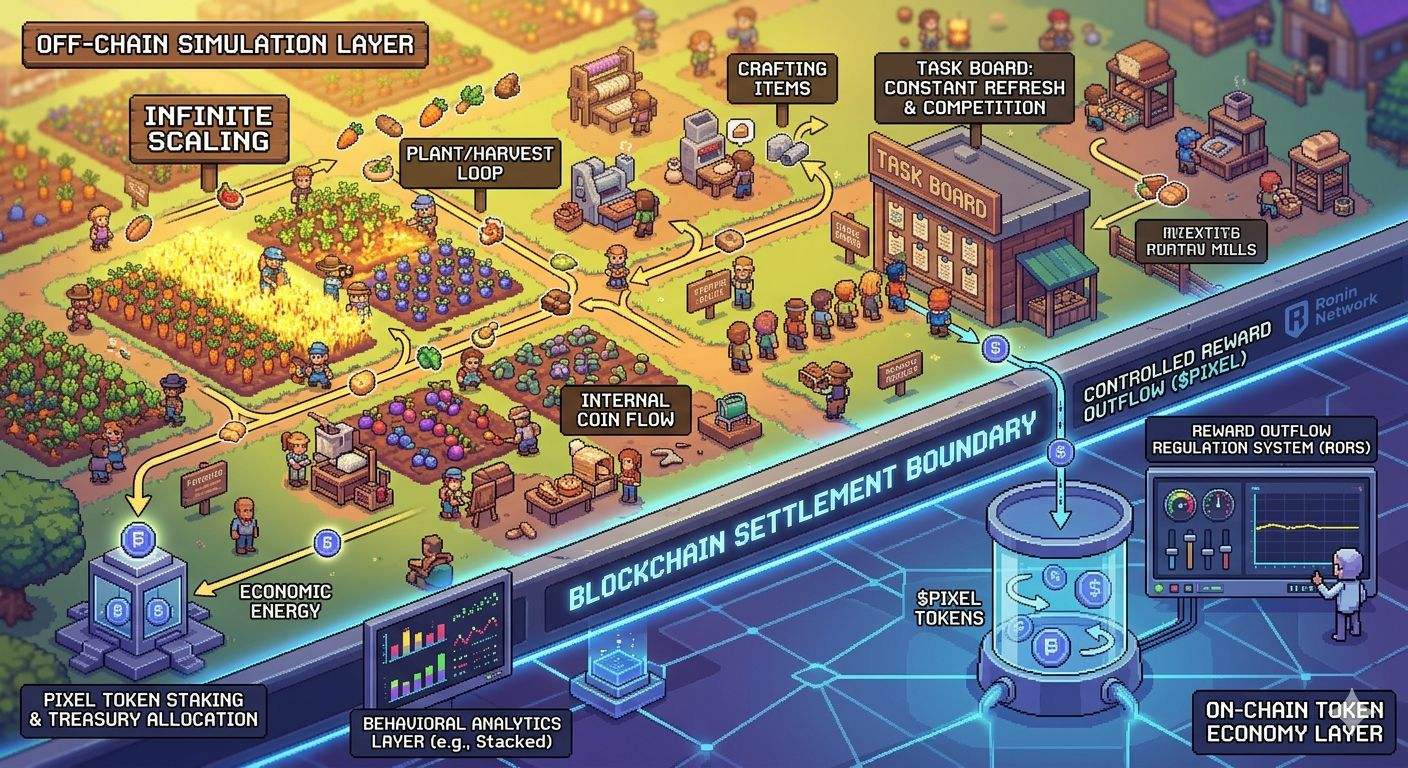 That question started to make more sense when I began thinking about the underlying infrastructure that powers the game. Pixels operates on the Ronin Network, but interestingly, most of what players actually do inside the game doesn’t immediately interact with the blockchain. Planting seeds, harvesting crops, crafting items, managing energy cycles, and circulating Coins all happen off-chain. These loops operate inside a simulation layer that can scale almost infinitely because it doesn’t require costly blockchain transactions for every action.