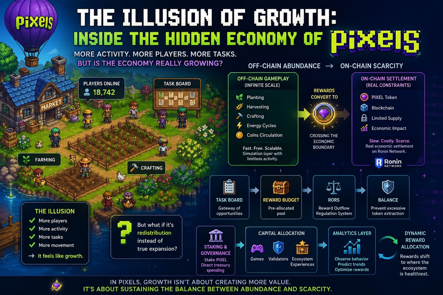 Pixels may not be designed to grow indefinitely in the way traditional online games do. Instead, it may be engineered to maintain equilibrium carefully regulating how tokens flow out of the ecosystem relative to how value flows into it.