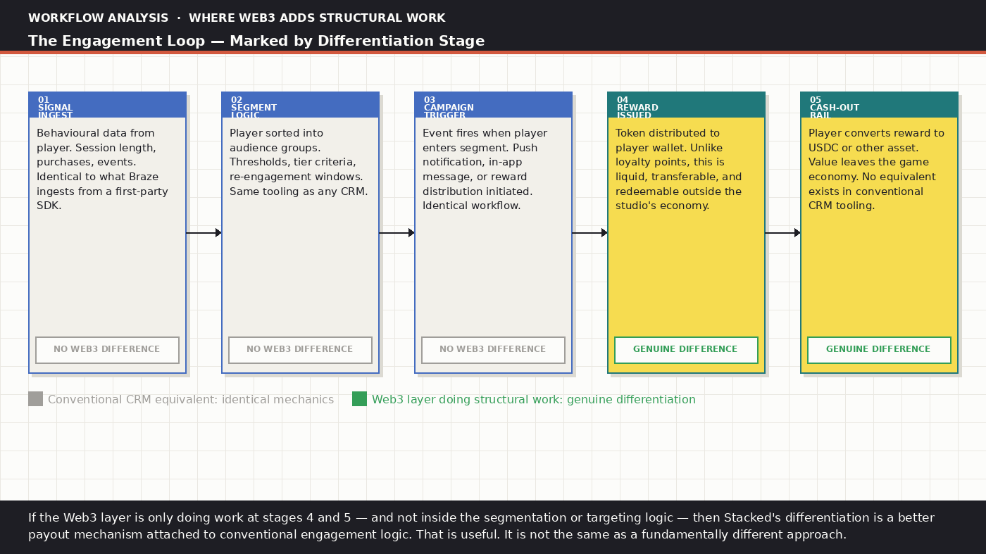 The harder question is whether that difference explains the engagement mechanics Stacked is documenting, or whether it is a separate feature that sits alongside those mechanics rather than inside them. A tiered loyalty program in Stacked works the same way as a tiered loyalty program in any CRM. Players accumulate activity, cross thresholds, and unlock higher tiers with better rewards. The tier logic, the threshold design, and the campaign triggering are identical. What is different is the denomination of the reward at the end of the chain. If the Web3 layer is only doing work at the cash-out rail and not inside the engagement mechanics themselves, then Stacked's actual differentiation is narrower than its use case documentation implies. It is a better payout mechanism attached to conventional engagement logic, which is a useful thing to be but not the same thing as a fundamentally different approach to player engagement.