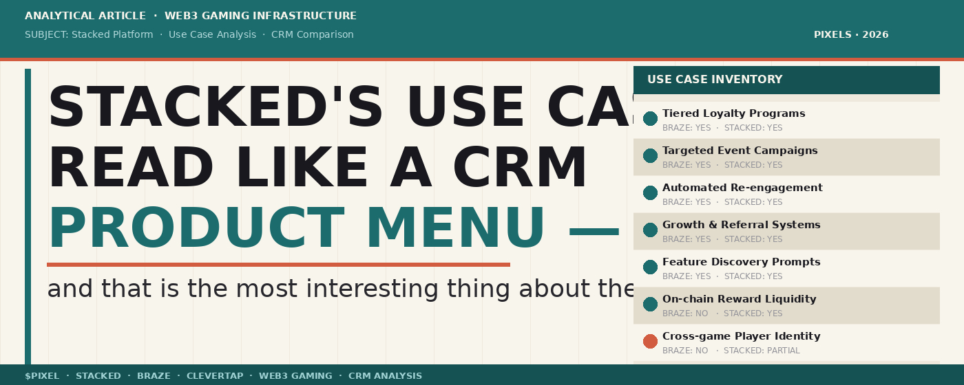 Whether Stacked's documented use cases are actually drawing on that capability, or whether they are currently running on the same first-party behavioural signals that any conventional SDK would capture, is something I cannot determine from the documentation alone. The use cases as described do not require cross-game identity to function. They require the same data inputs that Braze already ingests. If the cross-game layer is not yet informing the segmentation logic in practice, then the engagement mechanics are conventional and the differentiation is in the denomination of the reward.