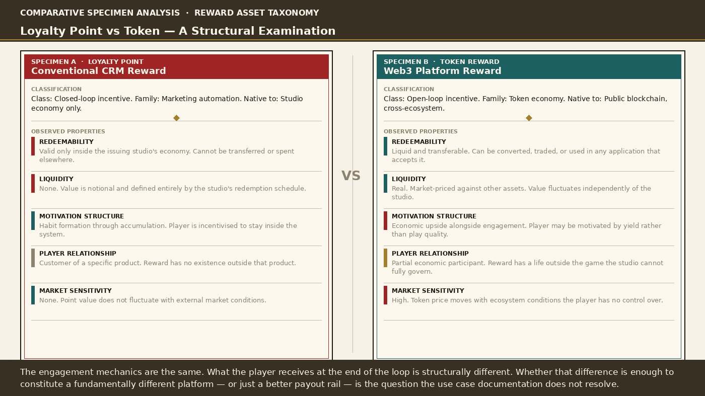Now consider what changes when the reward in that workflow is a token rather than a loyalty point. At the triggering stage, nothing changes. The behavioural signal is the same, the segmentation logic is the same, and the campaign event fires in the same way. What changes is what the player receives and what they can do with it. A loyalty point inside a conventional system is redeemable inside the system that issued it. It has no existence outside the studio's economy, no liquidity, and no transferability. A token on a public blockchain is liquid, transferable, and convertible into other assets. The player who receives it can hold it, sell it, use it in other applications, or ignore it. The reward has a life outside the game in a way that a loyalty point structurally cannot.