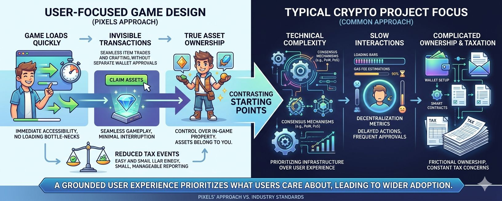 What Pixels seems to notice, quietly, is that users don't care about consensus mechanisms. They care about whether the game loads, whether transactions feel invisible, whether assets actually belong to them without turning every interaction into a tax event. That's a much more grounded starting point than most crypto projects ever have.