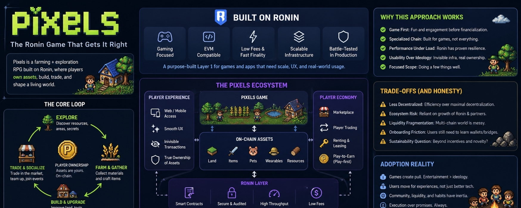 There are trade-offs, obviously. Ronin leans toward efficiency and usability over maximal decentralization. Purists will complain. They always do. But there is a point where ideological perfection becomes a product flaw. If nobody can use the thing comfortably, the philosophy doesn't matter much. Pixels seems willing to accept that compromise.