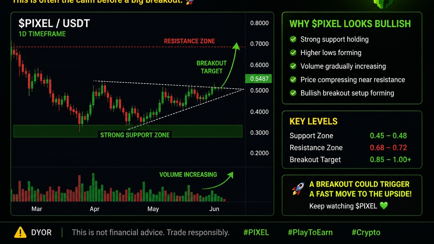 What makes this stage important is psychology — most traders lose interest during consolidation, but this is often where the next big move is being prepared. If volume starts expanding alongside a clean breakout above resistance, $PIXEL could enter a fast-moving expansion phase with sharp volatility and strong upside momentum 🚀