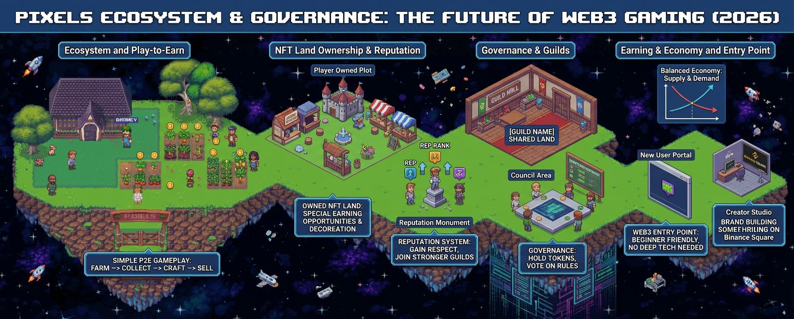 Pixels is not only about farming. players can build industries on their land and create long term systems. There is also a guild system where players work together as teams.