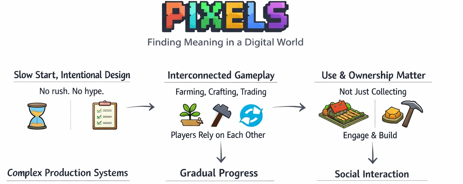 I’m waiting inside it, and that already feels like part of the experience. I’m looking at PIXELS the way I might look at a small room before I decide whether to sit down in it, and the first thing I notice is that it does not rush to impress me. It opens slowly. It gives me space to stand still for a moment and let my eyes settle. There is a softness in that, but also a kind of quiet pressure, because in Web3 nothing stays soft for long. Even the calm places usually have numbers behind them, and I can feel that here without having to be told. I focus on the surface first, on the open world, on the farm, on the small repeated actions that seem ordinary until they begin to collect meaning. A crop grows. A path opens. A task returns. The game lets these things feel simple, and that simplicity is part of what makes it strange.