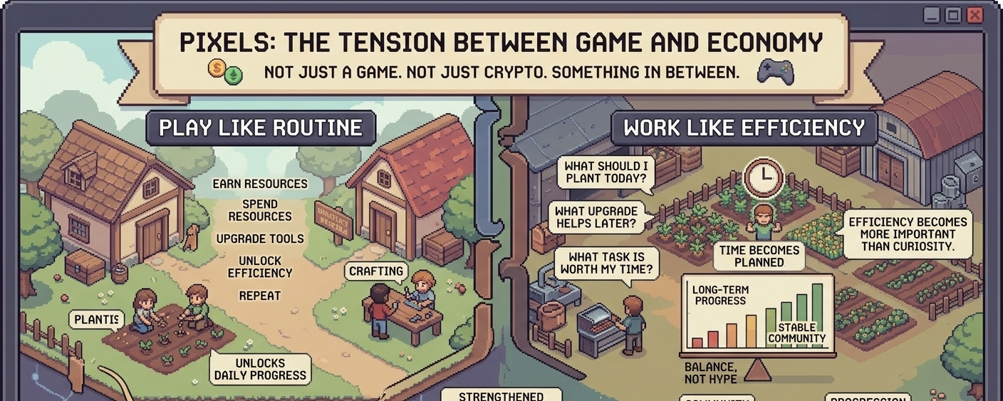 It looked too simple. A small pixel world where people farm, gather materials, build things, and walk around chatting. Nothing loud. Nothing dramatic. But the longer I looked at it, the more it felt like something else.