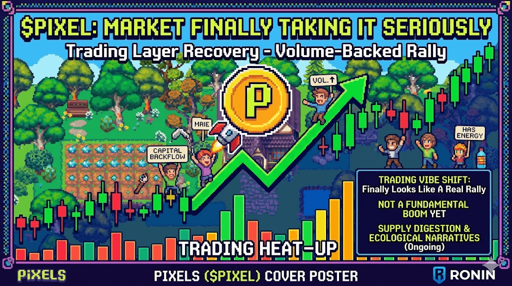 So if I had to sum up today’s @Pixels in a more relatable way, I’d say: it finally doesn’t feel as stifling as it did a few days ago; the market clearly has more spirit, and the trading layer looks much better. But at the same time, I won’t rush to interpret it as 'the new story has completely unfolded'. This phase feels more like a strong signal worth serious observation—it indicates the market is beginning to want to watch it, trade it, and discuss it again. But whether it can move from volume recovery to a more complete trend still depends on whether this capital inflow can continue, and if there will be more solid new catalysts from the project side. For me, the most important change today isn’t 'it’s gone up', but rather 'it finally looks like it’s doing something'. #pixel