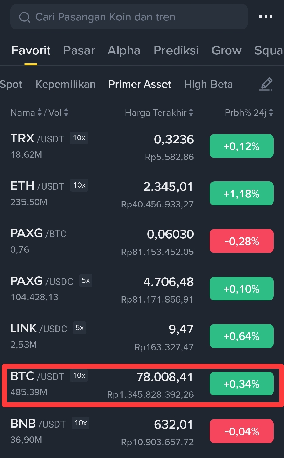 Kedua, Cari Bitcoin dengan pasangan BTC/USDT atau BTC/USDC