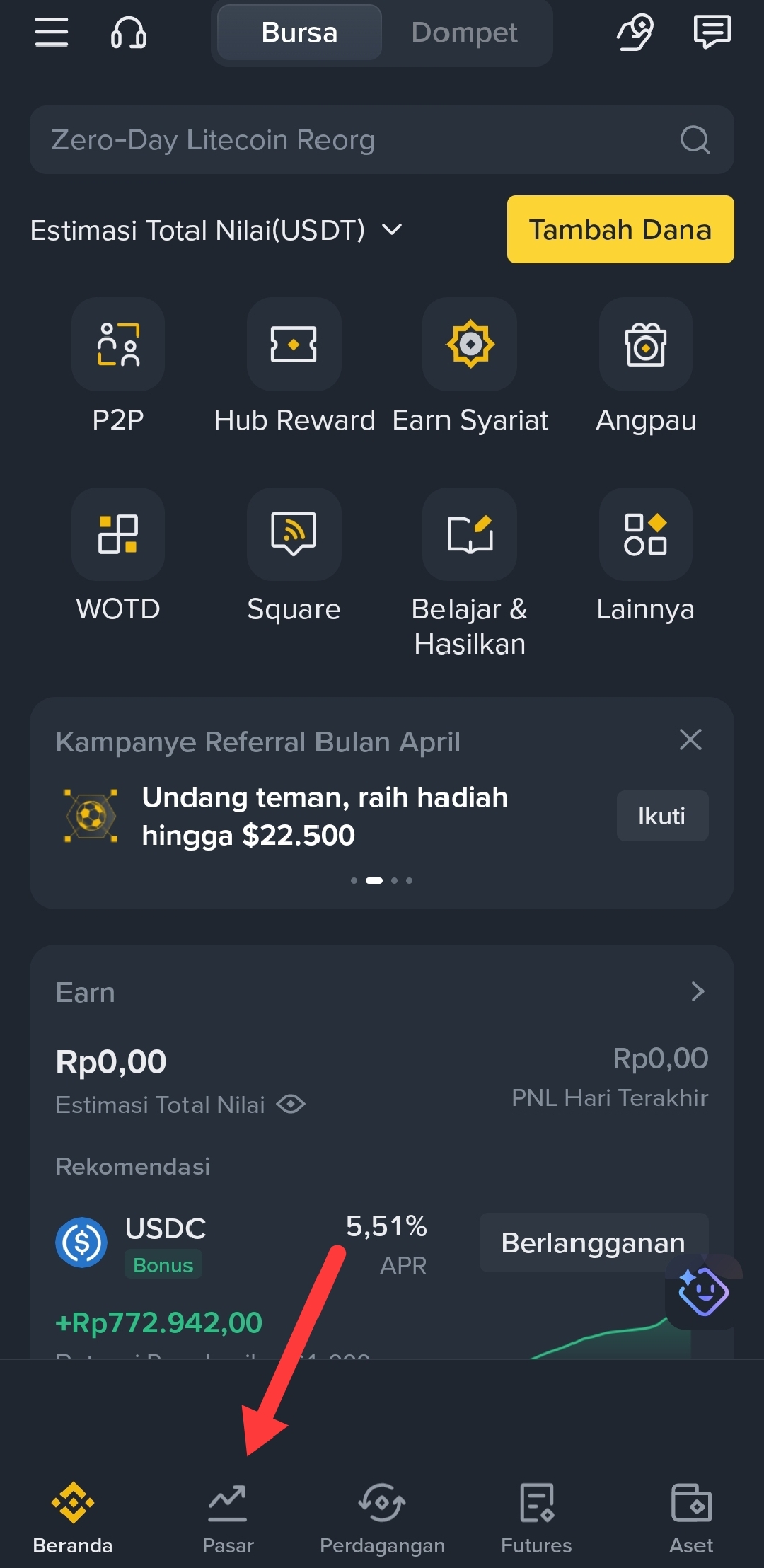 Pertama, Buka Aplikasi Binance dan masuk ke menu "Pasar"