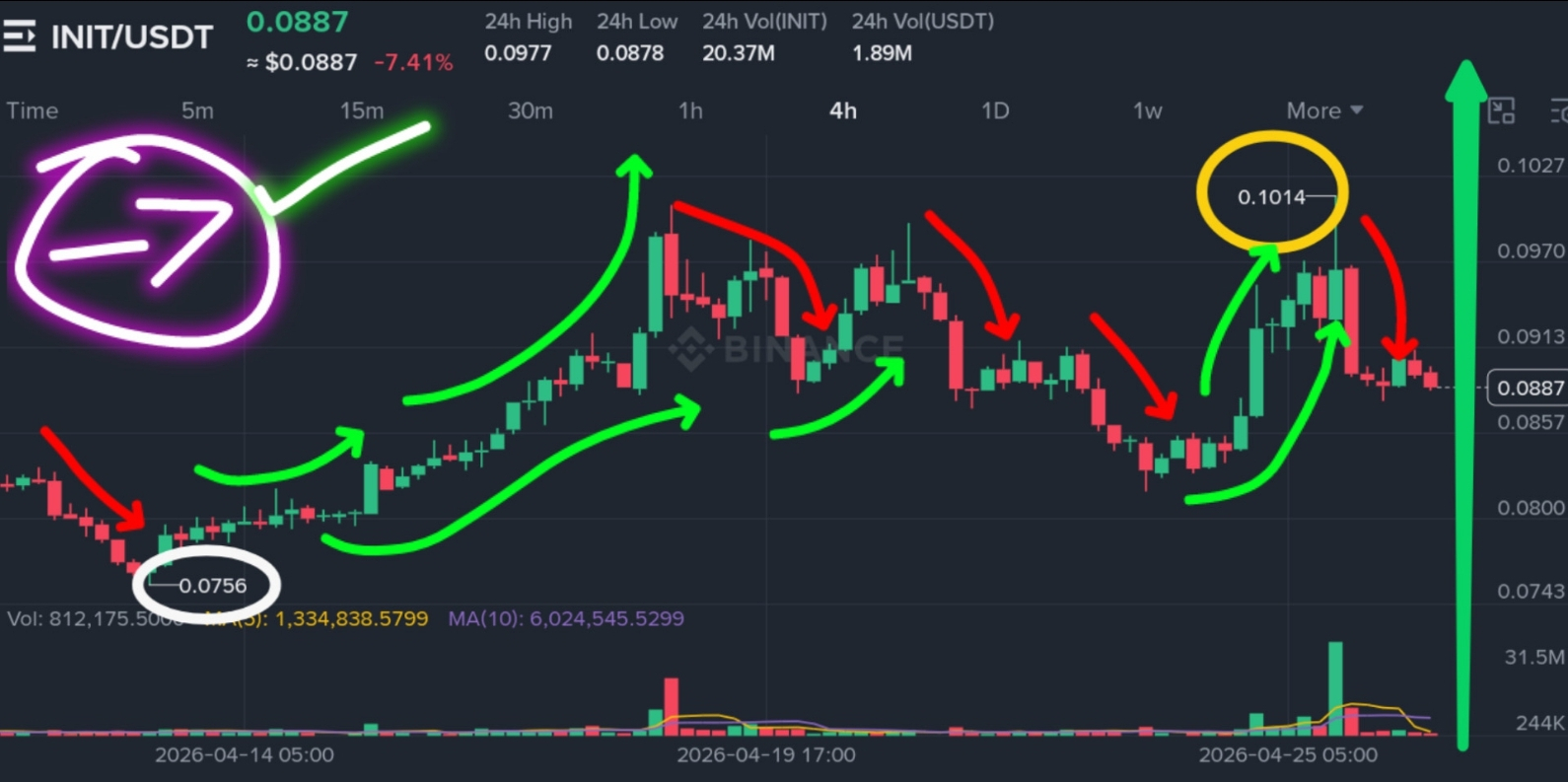 INIT climbed from $0.0756 to $0.1027, now at $0.092 (+17% swing). Volume hit $9.5M, a 3x spike from its month‑long average. The 4H chart printed a bullish “morning star” reversal pattern after finding support at $0.0756, and price has since climbed above the 20‑period EMA. RSI is 52, neutral – plenty of room to run.