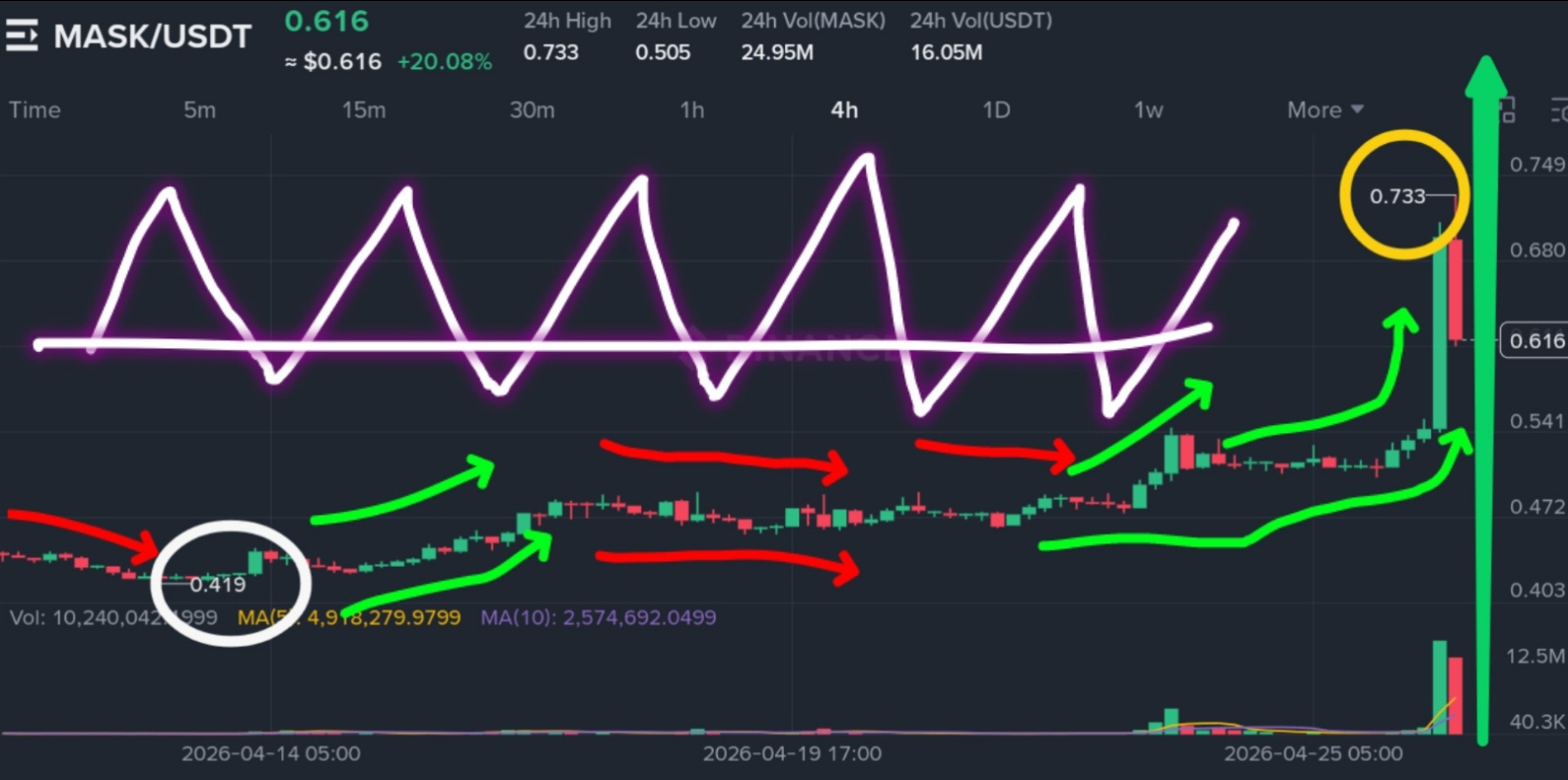 MASK surged from $0.505 to $0.733, now trading at $0.616 (+20.08%). Volume jumped to 2.5M MASK ($1.5M USDT), a 400% increase from the 30‑day average – the highest volume spike in 45 days. The 4H chart shows a sharp rejection at $0.733, forming a classic “shooting star” candle. RSI hit 78 and has cooled to 65.