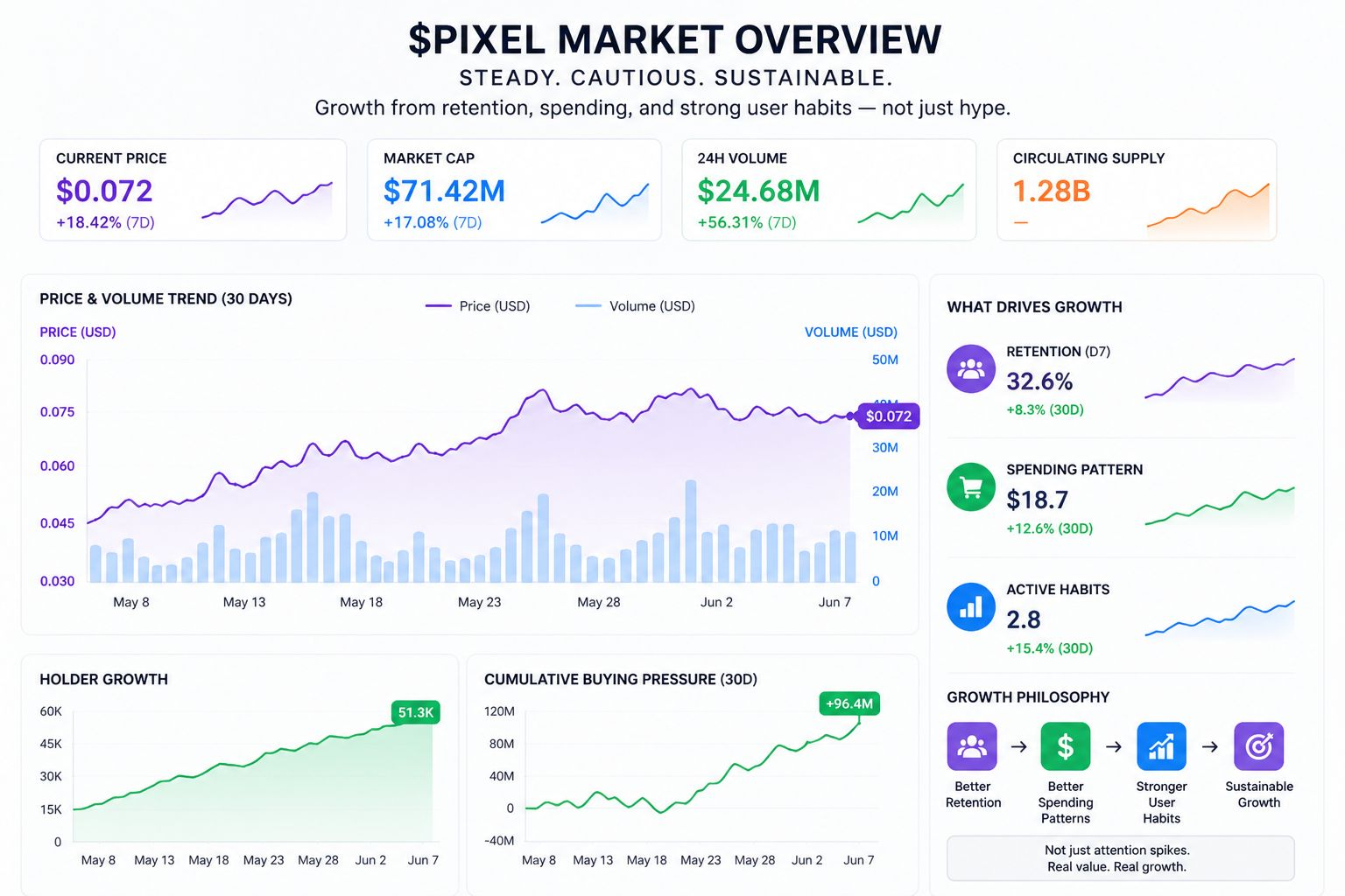 When I look at $PIXEL today the market feels steady but cautious. There is movement but not explosive hype. That makes sense to me. Systems like this do not grow overnight. If it works then growth will come from better retention. Better spending patterns. And stronger user habits. Not just attention spikes.