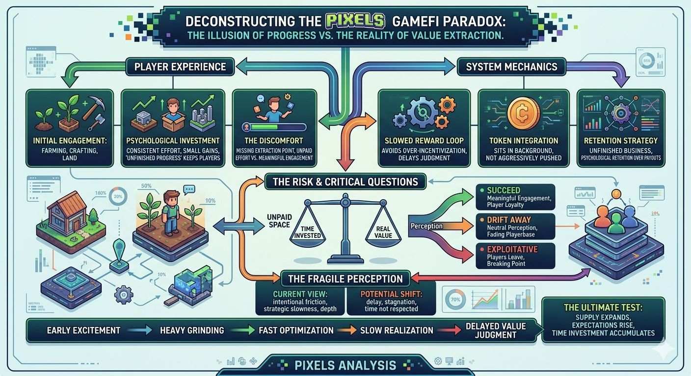 I keep coming back to one core idea while watching Pixels. Most of the time you spend inside the system doesn’t immediately pay you. That’s not a small detail—it’s the foundation of everything. Whether Pixels succeeds or fails will depend on how that unpaid space is perceived. If it feels meaningful, players will stay. If it feels neutral, they’ll slowly drift away. And if it starts to feel exploitative, they’ll leave.