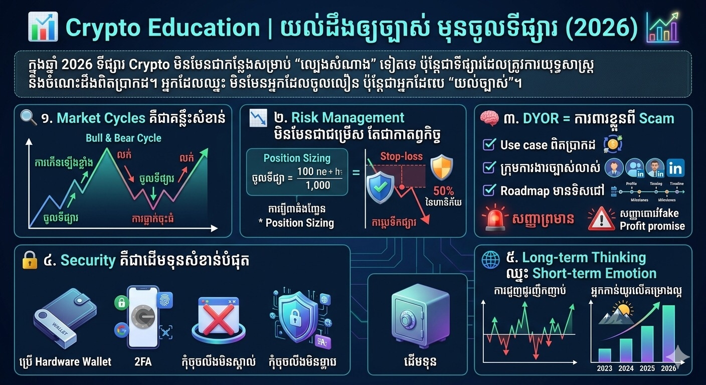 🚀 ក្នុងឆ្នាំ 2026 នេះ ទីផ្សារ Crypto មិនមែនជាទីលានសម្រាប់ "ល្បែងផ្សងសំណាង" ទៀតទេ ប៉ុន្តែវាជាទីផ្សារដែលទាមទារនូវយុទ្ធសាស្ត្រ និងចំណេះដឹងពិតប្រាកដ។ អ្នកដែលទទួលបានជោគជ័យ មិនមែនជាអ្នកដែលចូលទីផ្សារមុនគេនោះទេ ប៉ុន្តែគឺជាអ្នកដែល "យល់ដឹងស៊ីជម្រៅ" បំផុត។