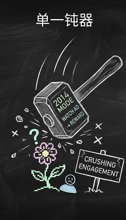 Single blunt instrument: Simplifying complex incentive mechanisms to 'watch ads \rightarrow receive rewards', this 'blunt instrument' harms the narrative logic of the game.