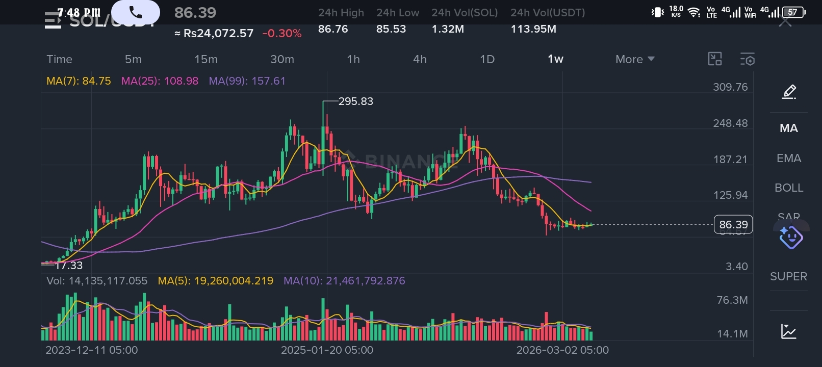#Solana (SOL) is currently trading at a pivotal point on the weekly timeframe. After a significant correction from its local highs, the price is now hovering around the $86.39 mark.