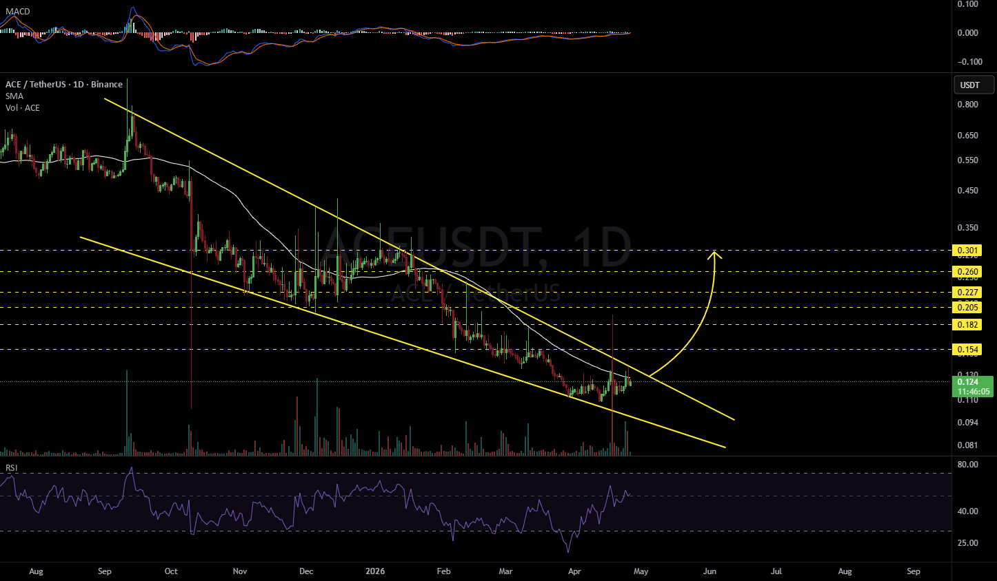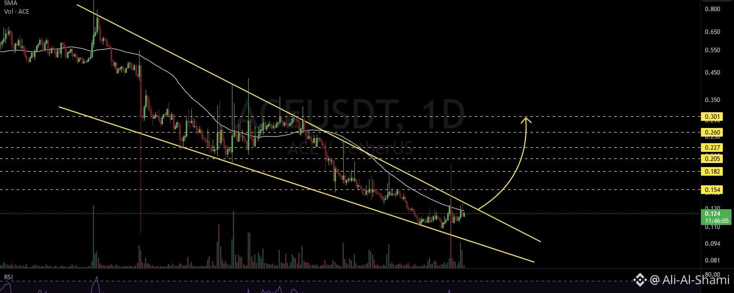 #ACE It's moving within a descending wedge pattern on the daily candlestick chart. Consider entering this coin after confirming a breakout above the wedge resistance and the daily SMA50. In this case, the bullish targets are: