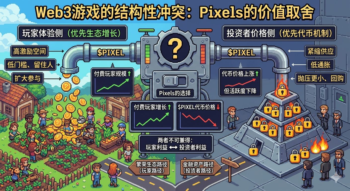 If prioritizing players, it becomes a constantly expanding gaming system, but the token struggles to maintain strength long-term; if prioritizing investors, it turns into a more financialized asset system, but game activity will decline. Both paths are valid but cannot coexist.