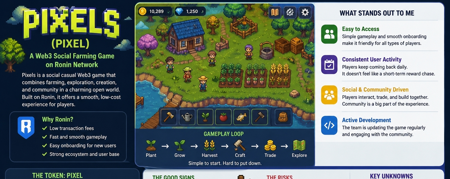 I’ve been looking at Pixels for a while now, and the more I sit with it, the more it feels like one of those projects that doesn’t really reveal its true shape in the beginning. At first glance, it looks simple—almost too simple. A farming-based social game built on Ronin where people grow, explore, and build over time. Nothing flashy on the surface, nothing that screams innovation immediately. But in crypto, I’ve learned that what looks simple is sometimes where the real experiment is happening.