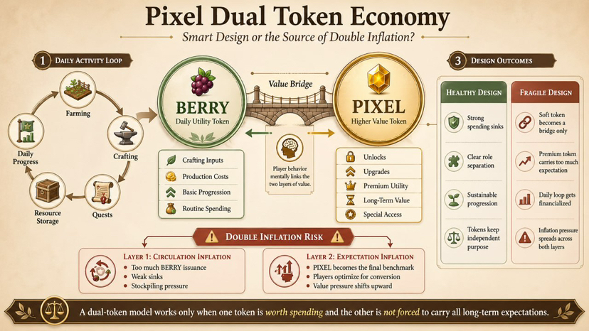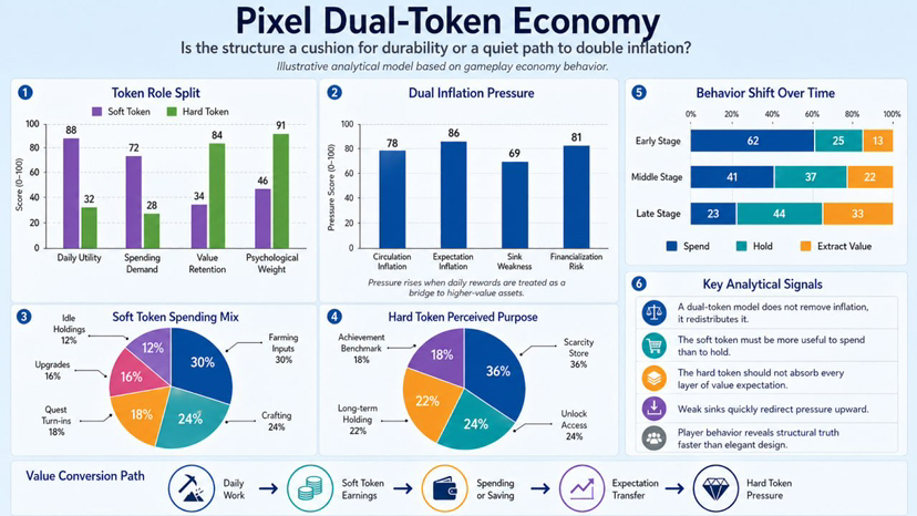 This is where I think many people judge too quickly. A dual token structure does not automatically fight inflation, it only splits the pressure into several layers that are harder to see. If at some stage Pixel cannot generate enough real consumption demand for the softer token, players will delay spending and turn toward accumulation instead. And if the harder token has to carry the image of scarcity, preserve confidence, and also act as the final destination of every psychological conversion, then sooner or later it will be forced to do too many jobs at once. To be honest, that is always a sign of a structure beginning to tighten beyond its limits.
