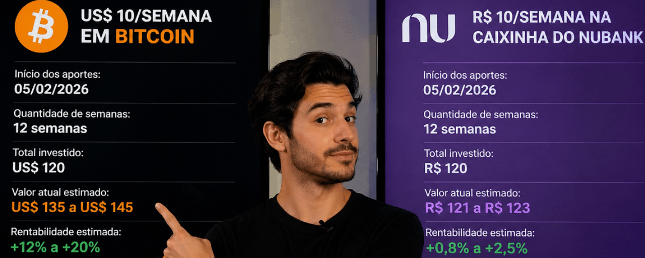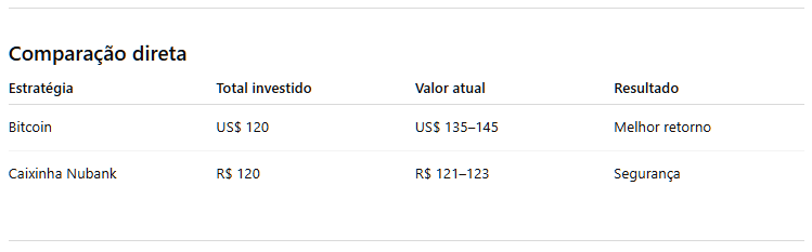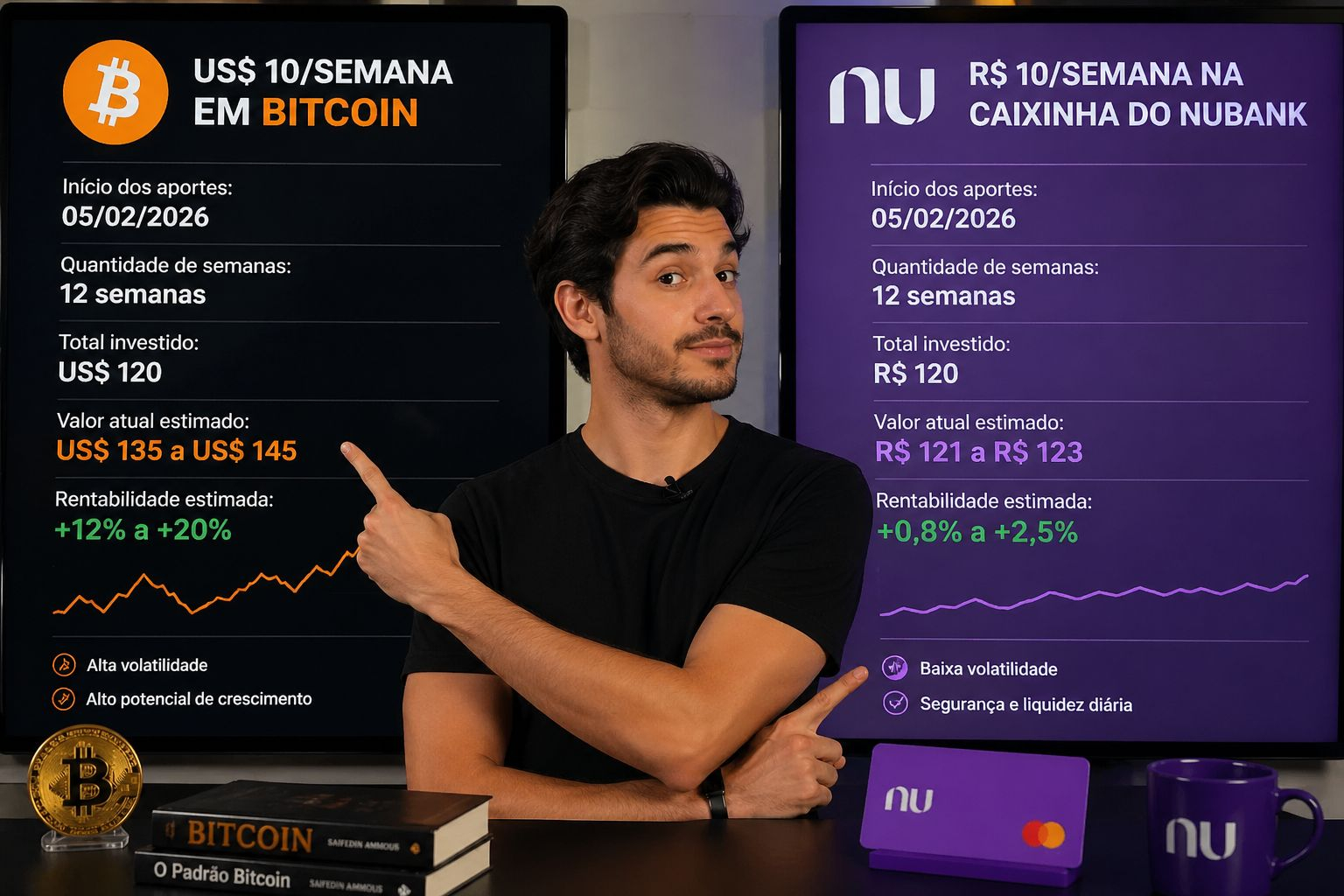 Alguns investidores se perguntam: é melhor US$ 10 por semana em $BTC Bitcoin, ou R$ 10 por semana na Caixinha do Nubank?