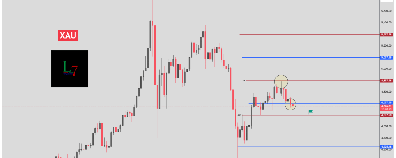 With this structure, there is a high probability that price may continue moving lower to test the First Cycle Completion (CC) level around 4597.98.