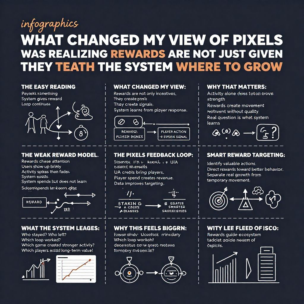 That is the easy reading. And honestly, that is how most people still look at rewards in games. Rewards are treated like fuel. Give players enough reason to show up, and activity starts moving. But the more I looked at Pixels’ official direction, the less rewards felt like simple incentives and the more they started looking like signals. Not just something the system gives out, but something the system can learn from.