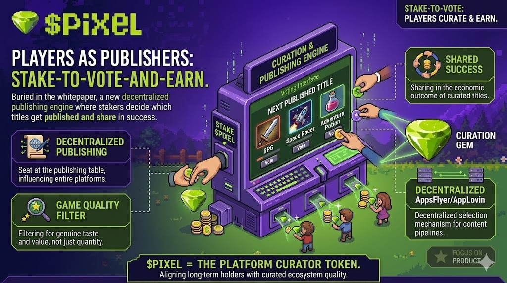 What Pixels seems to be building is different. Players stake $PIXEL, and in return they get influence over which games enter the ecosystem. Not just exposure to those games. Actual input into whether they get published. And then they share in the economic outcome of whatever they voted in.