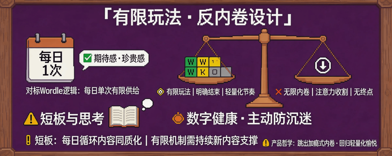 Wordle 赢了,不是因为它比 TikTok 更好玩,而是因为它给了用户一种完全不同的体验节奏——它尊重你的时间,给你一个明确的"今天结束了"的信号,让你可以放心关掉它,因为你知道明天它还在。