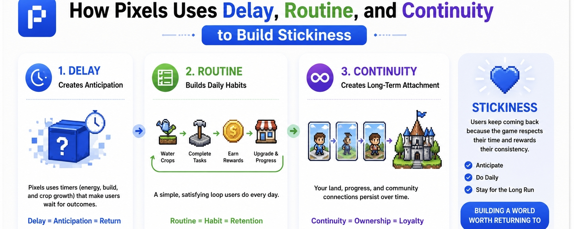 Pixels’ biggest retention lesson is simple but powerful: players do not always stay because the game gives them more rewards. They stay because the game makes their previous actions feel important. When progress has continuity, leaving the game creates a small feeling of incompletion. Returning feels natural because the player is not starting from zero. They are coming back to something that already carries their effort, timing, and memory.