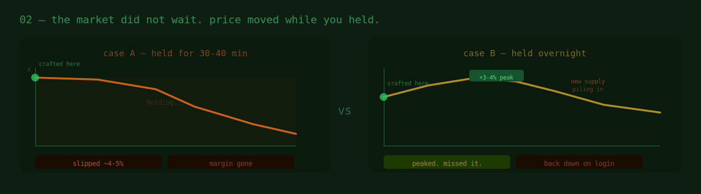 i tracked one item over a couple of hours. when i first crafted it, the market price was around X. i held it, thinking it might move up 2–3%. instead, within about 30–40 minutes, more listings came in and the price slipped by ~4–5%. nothing dramatic, just enough to turn a decent margin into something barely worth listing. in another case, i held a batch overnight and saw the opposite price moved up ~3–4%, but by the time i logged back in, new supply had already started pushing it back down.