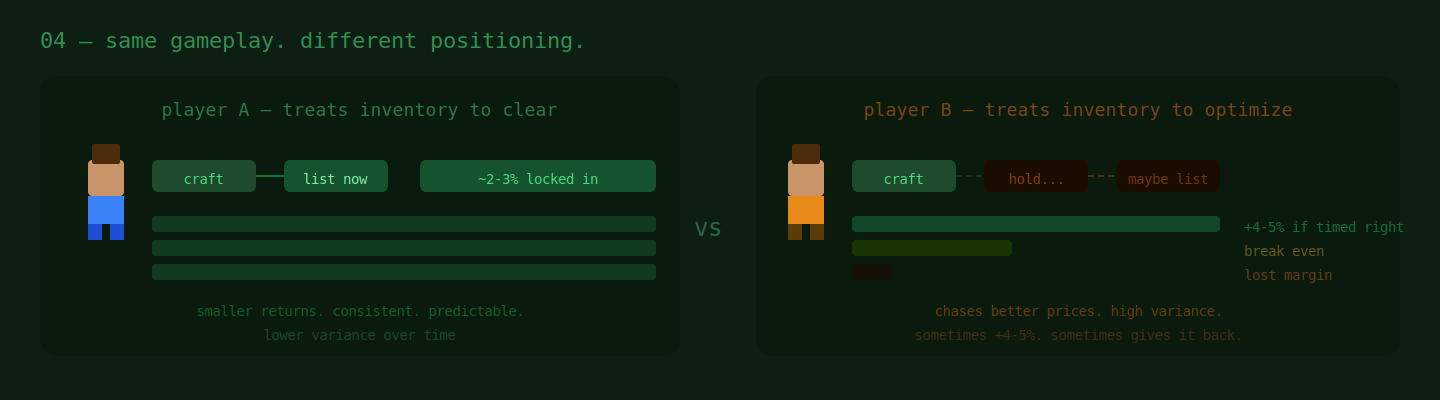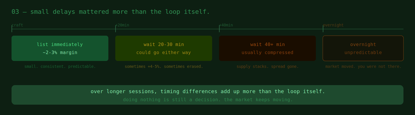 i started noticing that small delays mattered more than i expected. listing immediately after crafting might lock in a ~2–3% margin, nothing exciting but consistent. waiting even 20–30 minutes could shift that completely, sometimes up a bit, sometimes down enough to erase the profit. over longer sessions, those small differences add up more than the loop itself.